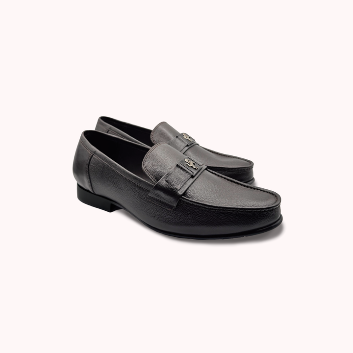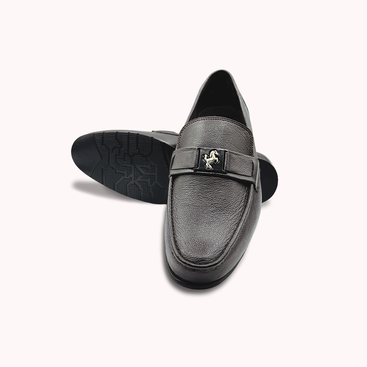 Step into sophistication with these stylish dark brown loafer shoes. Made from high-quality textured leather, they feature a striking silver horse emblem on the strap, adding a unique and elegant touch. The slip-on design provides ultimate convenience, while the durable sole ensures comfort and long-lasting wear. These versatile loafers are perfect for both a sharp formal look and a refined casual style.