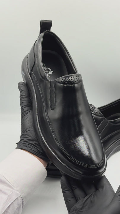 Experience all-day comfort without sacrificing style. These classic black Synthetic slip-ons feature a modern, cushioned sole and a sleek finish, making them perfect for the office, business meetings, or formal events. Easy to wear and built to last.