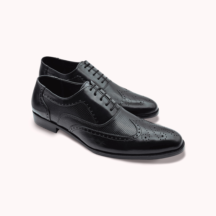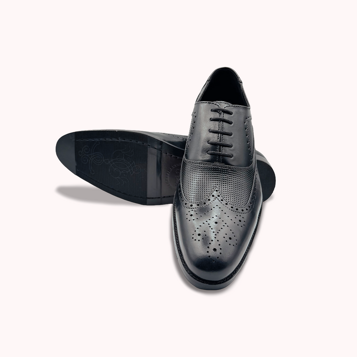 Elevate your formal look with these classic black brogue oxford shoes. Made from high-quality leather, these shoes feature a sophisticated perforated and checkered design on the vamp, adding a unique and elegant touch. The lace-up closure provides a secure fit, while the durable sole ensures comfort and long-lasting wear. These stylish dress shoes are perfect for any formal event, business meeting, or special occasion.
