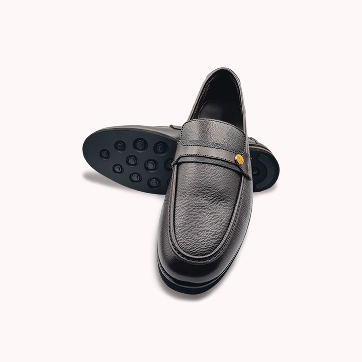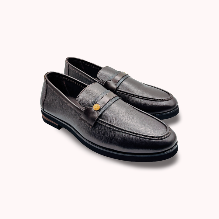 Step into comfort and style with these elegant dark brown loafer shoes. Made from high-quality textured leather, they feature a unique gold-toned button detail on the strap, adding a touch of sophisticated flair. The slip-on design provides ultimate convenience, while the durable sole ensures a comfortable and secure stride. These versatile loafers are perfect for enhancing both your professional and casual looks