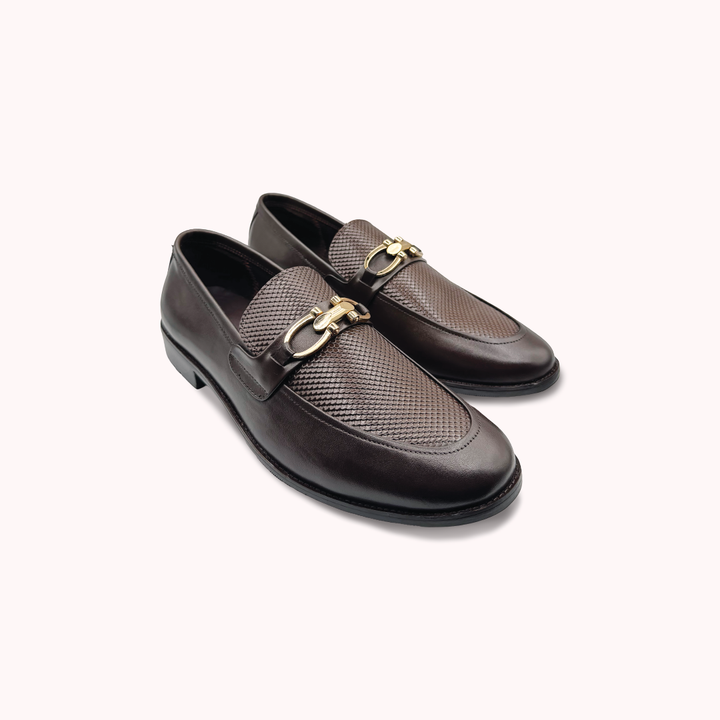 Step into sophistication with these stylish dark brown loafer shoes. Made from high-quality leather, they feature a striking woven or checkered pattern on the vamp, adding a unique and elegant texture. The classic gold-toned bit on the strap gives a touch of timeless style, making these loafers perfect for both professional and casual settings.